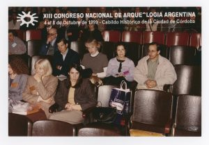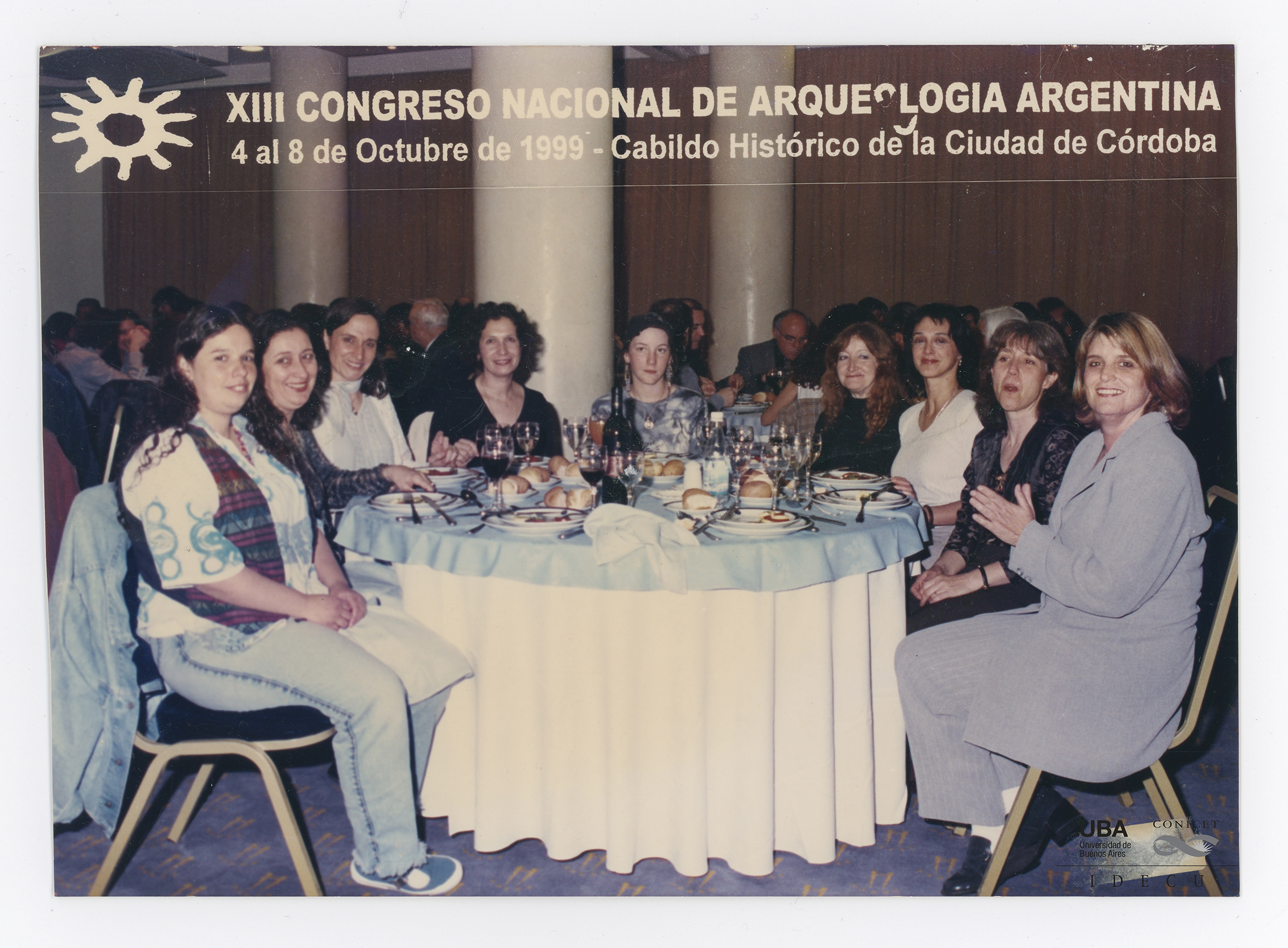 Retrato de Myriam Tarragó junto a colegas en la cena del XIII Congreso Nacional de Arqueología Argentina